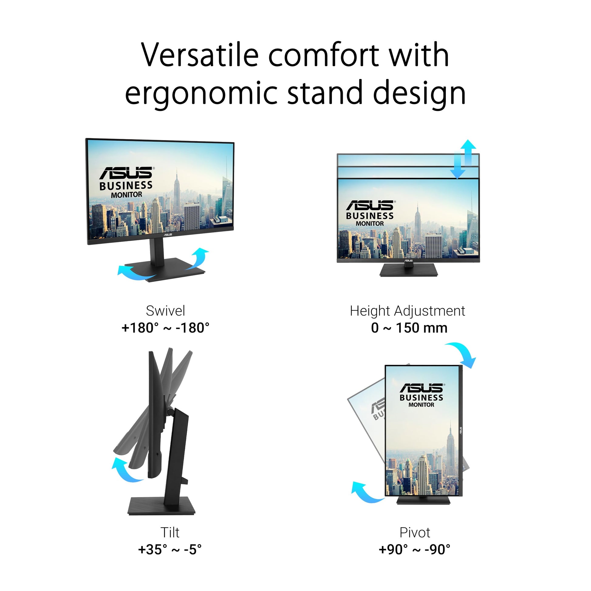 - Design ergonomico con regolazioni di inclinazione, rotazione, rotazione e altezza per un'esperienza visiva confortevole